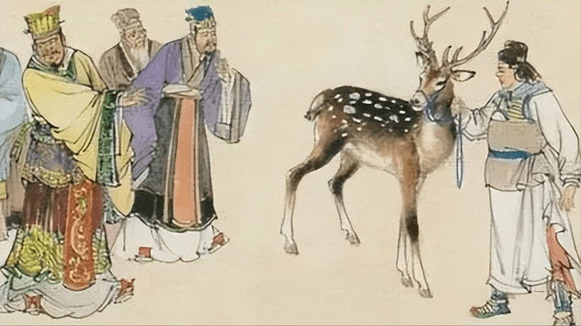 管仲派去的商人在楚国到处扬言:“齐桓公好鹿,不惜重金。”