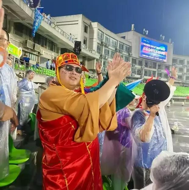 赣超联赛景德镇对阵九江的那天,景德镇的球场下着瓢泼大雨。游志庚自驾从九江赶过去,不是去踢球,是去给家乡球队加油的。为了活跃气氛,他还特意穿上“唐僧”的行头,在看台上又蹦又喊,成了现场一道特别的风景。