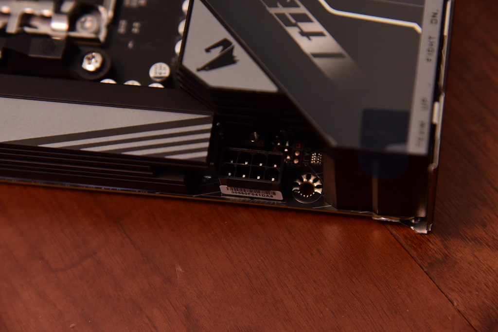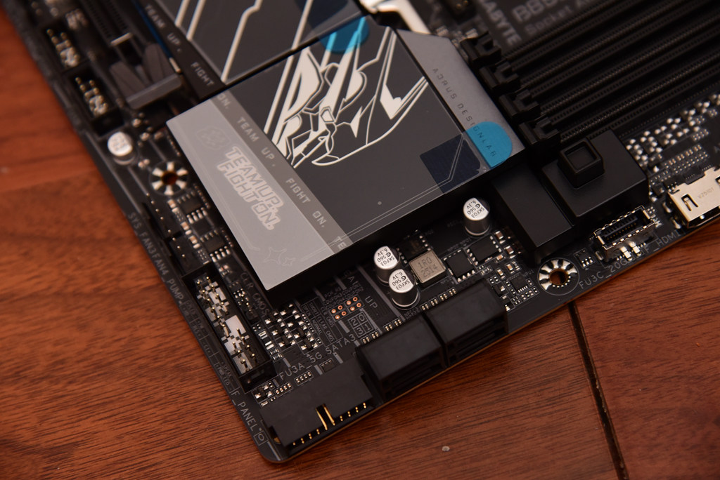 南桥部分覆盖着巨大的一体式散热装甲,配备了4个横向SATA接口,1个USB3.0扩展接口,节省了机箱内部纵向空间。散热片上覆盖有专属LOGO标识。