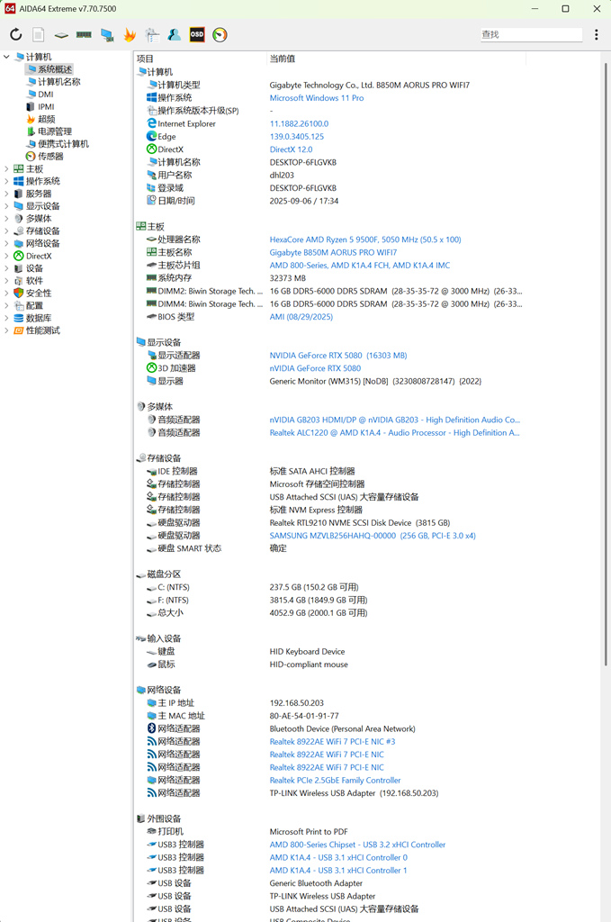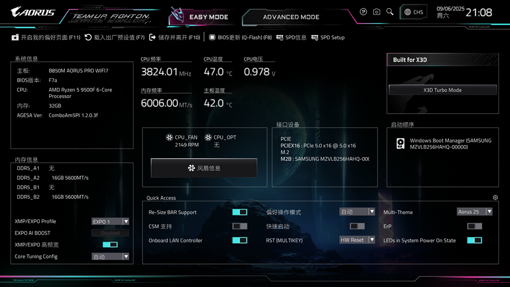 主板:GIGABYTE B850M AORUS PRO WIFI7