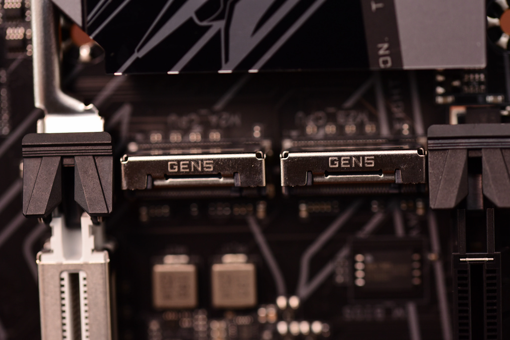 主板配备了2条M.2插槽,2条都可以直连CPU,支持PCI-E 5.0x4传输标准,都可以支持22110规格的固态硬盘,最快传输速度可以达到128Gbps,非常给力。