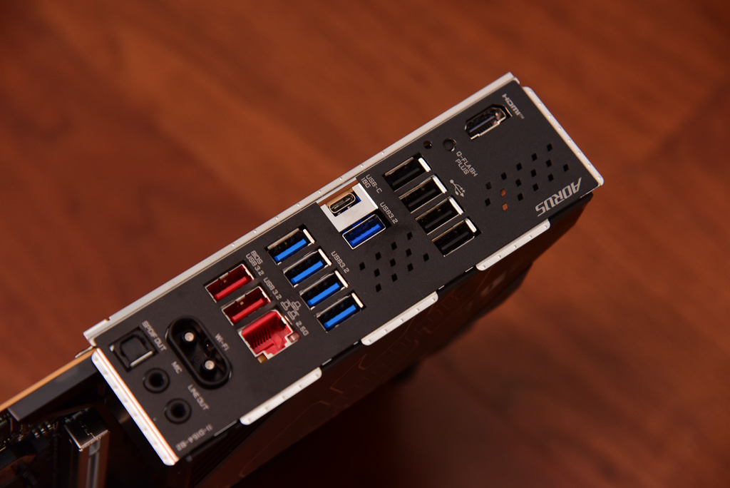 存储方面:主板配备了4条黑色内存插槽,最大支持256GB容量,内存最高支持频率可达8600+Mhz。内存插槽旁边配备了DEGUG指示灯,方便玩家监控主板状态。主板BIOS中内置技嘉独特的AI内存黑科技2.0技术,打开高带宽,低延迟功能后,可轻松提升主机性能。内存插槽旁边配备显卡易拆按键,TYPE-C机箱前置接口。