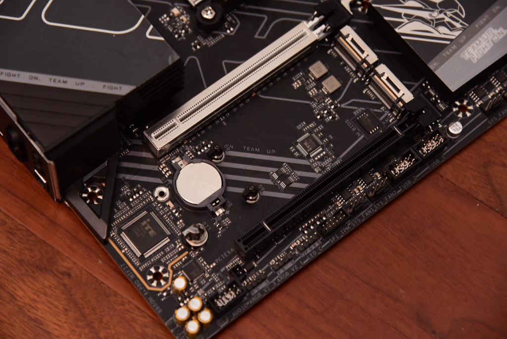 扩展方面:主板配备了2条PCI-E插槽用来安装显卡及其他设备,最上方1条是白色的PCI-E 5.0x16插槽,覆盖了合金装甲,避免在显卡重压之下,发生变形或损坏,同时,显卡支持一键快拆。下方一条是PCI-E 4.0x4插槽。上方PCI-E显卡插槽直连CPU。