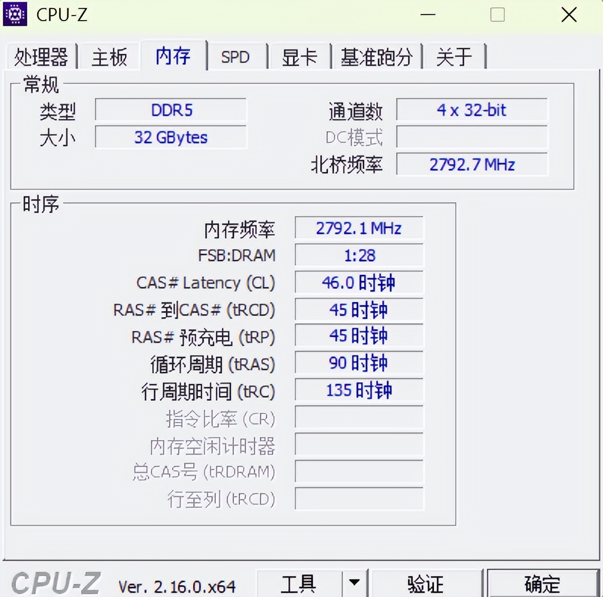 1、默认频率5600MHz,不进行任何设置,默认状态下时序为CL46-45,延迟为100ns。