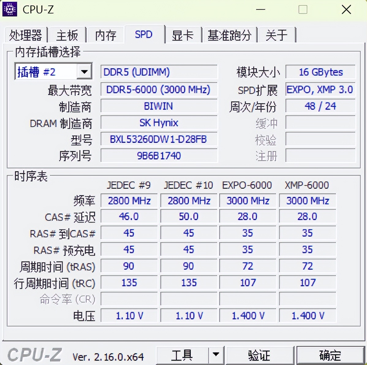 2、EXPO超频到频率6000MHz,不使用高带宽低延迟功能,时序自动设置为CL28-35,延迟为80.1ns。