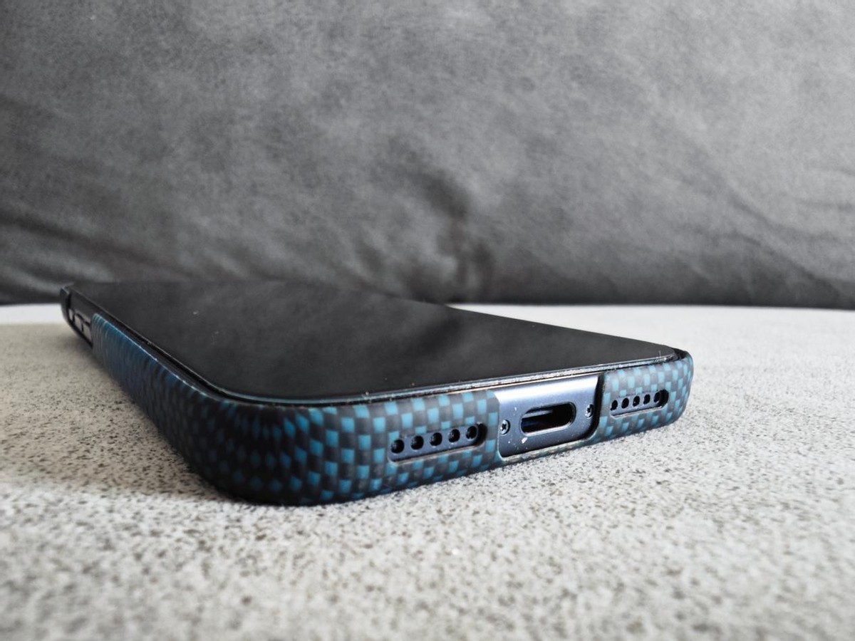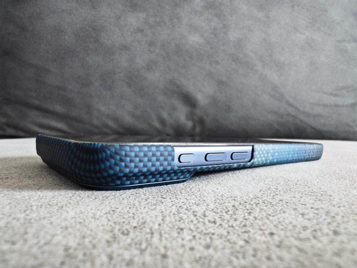 手机壳的背面,可以明显看到不同颜色芳纤维的编织花纹,非常有质感。摸上去的手感也可以明显感觉到经纬线之间的凹凸感,比17Pro的金属感要好很多,握感实在而舒适。
