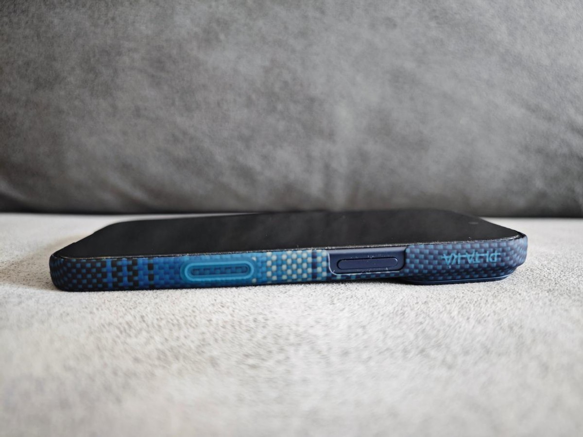 电源键部位做了开放设计,不会对日常使用带来阻力。按键上方的边框还有PITAKA的LOGO,细微处展现品牌的力量。
