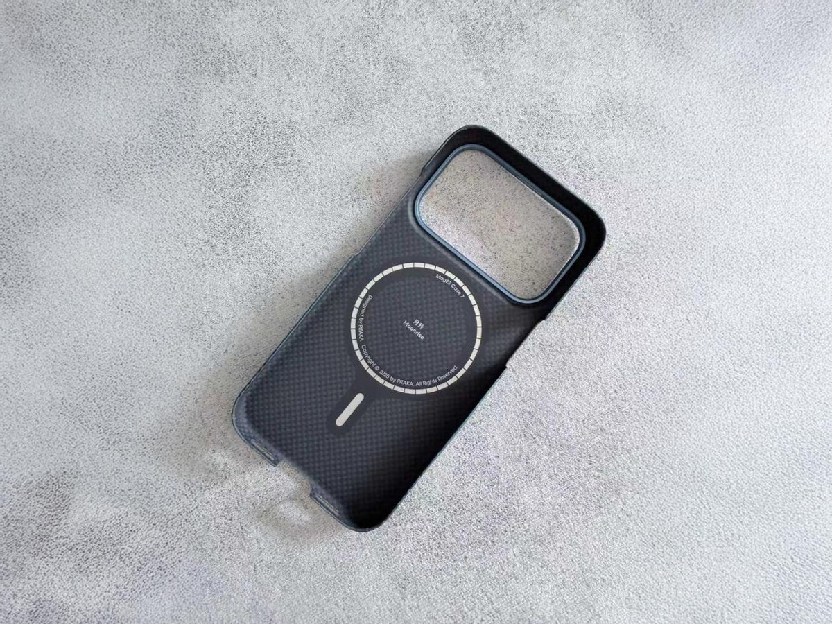 虽然只有18.1克的重量,手机壳还是提供MagSafe磁吸功能,真的令人惊叹!磁环和手机内面平齐,要知道这款手机壳的厚度只有0.97mm,真是非常极致,足见PITAKA的设计功力!