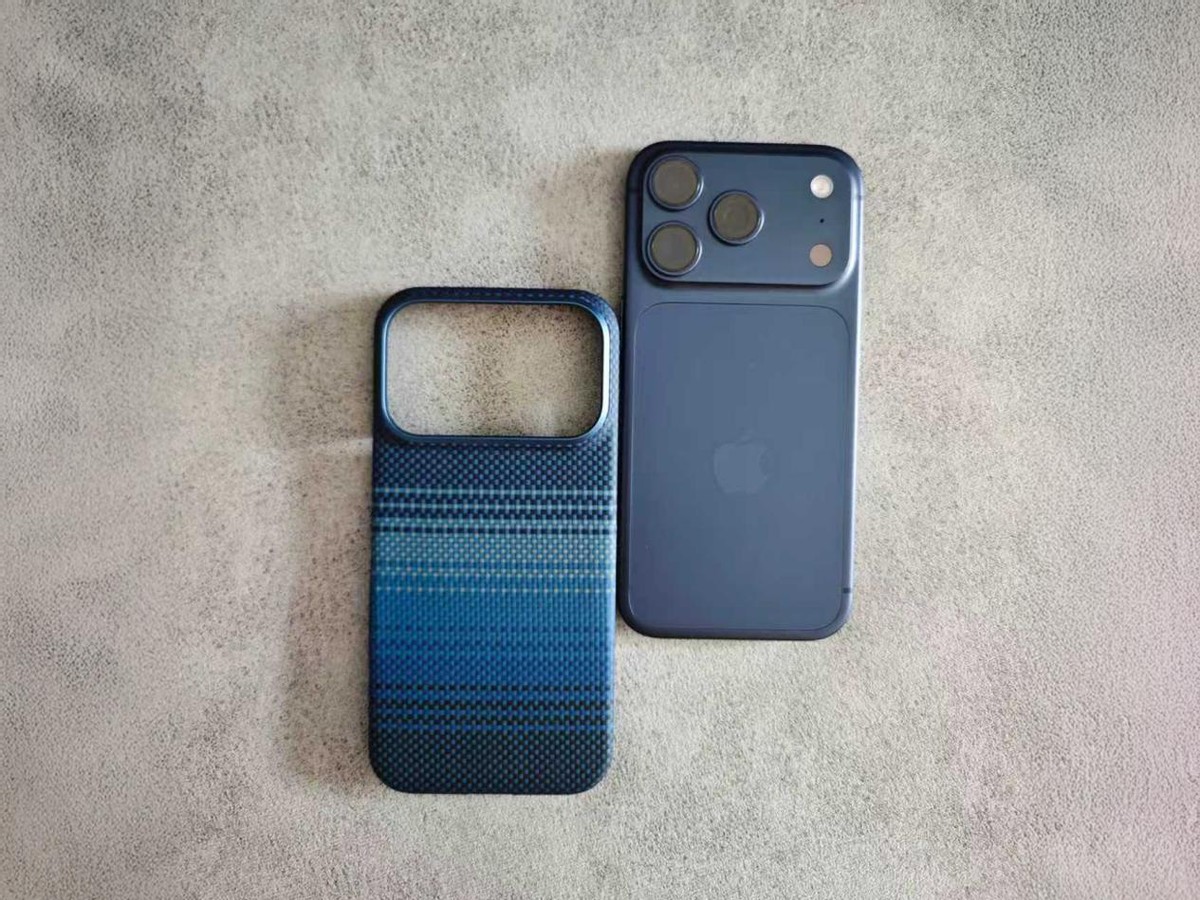 月升的颜色和iPhone17Pro的蓝色很接近,个人觉得这个是最匹配蓝色款iPhone17Pro的手机壳了,可以说是浑然天成。纤维间的渐变过渡自然,经纬间交错的立体感让手机颜值倍增。