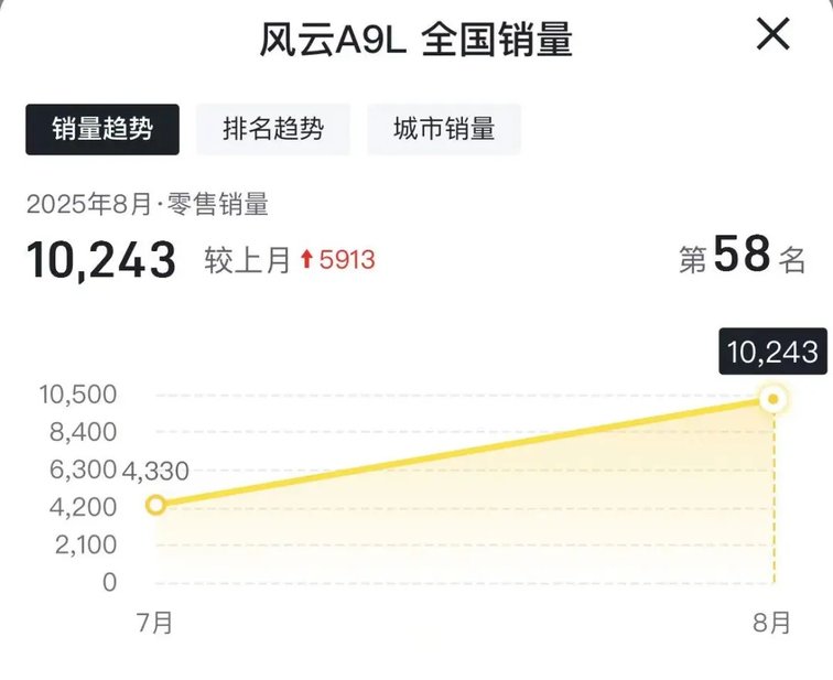 与合资品牌的分化表现不同,自主品牌新能源车型在 8 月整体势头强劲。奇瑞风云 A9L 于 7 月上市后迅速起量,8 月销量即突破万辆大关,达到 10,243 辆,成为奇瑞在新能源赛道的重要增长点。