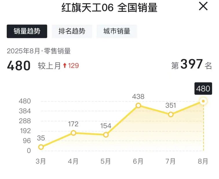 红旗品牌的新能源转型则面临更大挑战。尽管红旗品牌 8 月整体销量突破 4 万辆,但天工系列新能源车型表现持续低迷:天工 06 销量 480 辆,天工 05 约 259 辆,天工 08 仅 145 辆,三款车合计不足千辆,与品牌整体增长形成鲜明反差。作为红旗新能源战略的核心布局,天工系列未能打开市场,反映出传统豪华品牌在电动化转型中的困境。