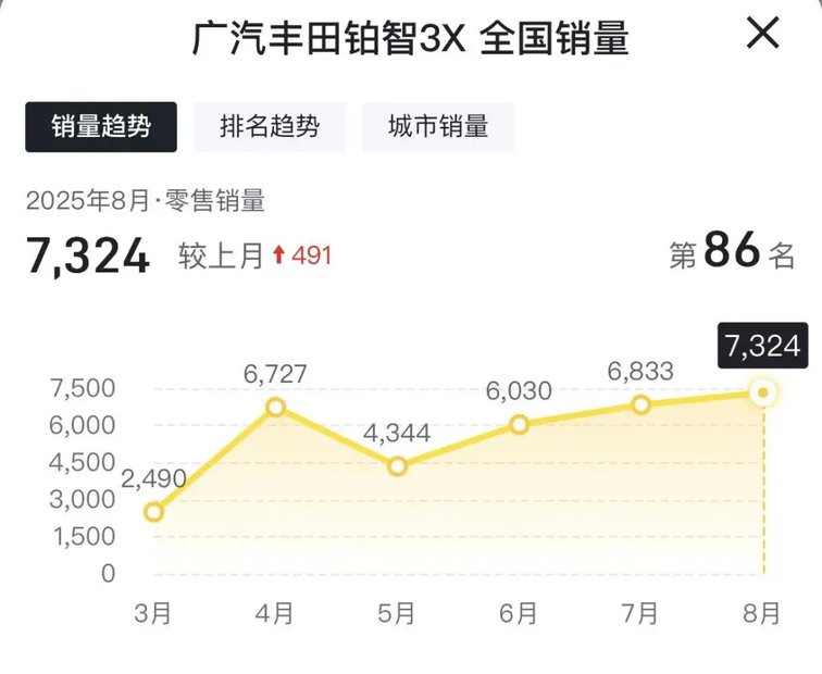 广汽丰田铂智 3X 同样表现稳健,8 月销量达 7,324 辆,距万辆门槛仅一步之遥。作为一款 3 月上市的新车,其 10.98 万起的定价击穿合资纯电底价,加上智能辅助驾驶系统的 25 大项功能加持,使其订单排期一度延长至 6 月,展现出强大的市场潜力。