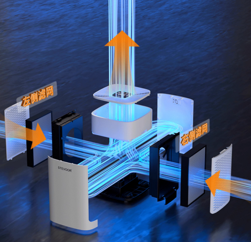 2. 双风道过滤系统:实现360°全方位空气循环,大幅提升净化效率,甲醛CADR值达550m³/h,颗粒物CADR值达906m³/h;