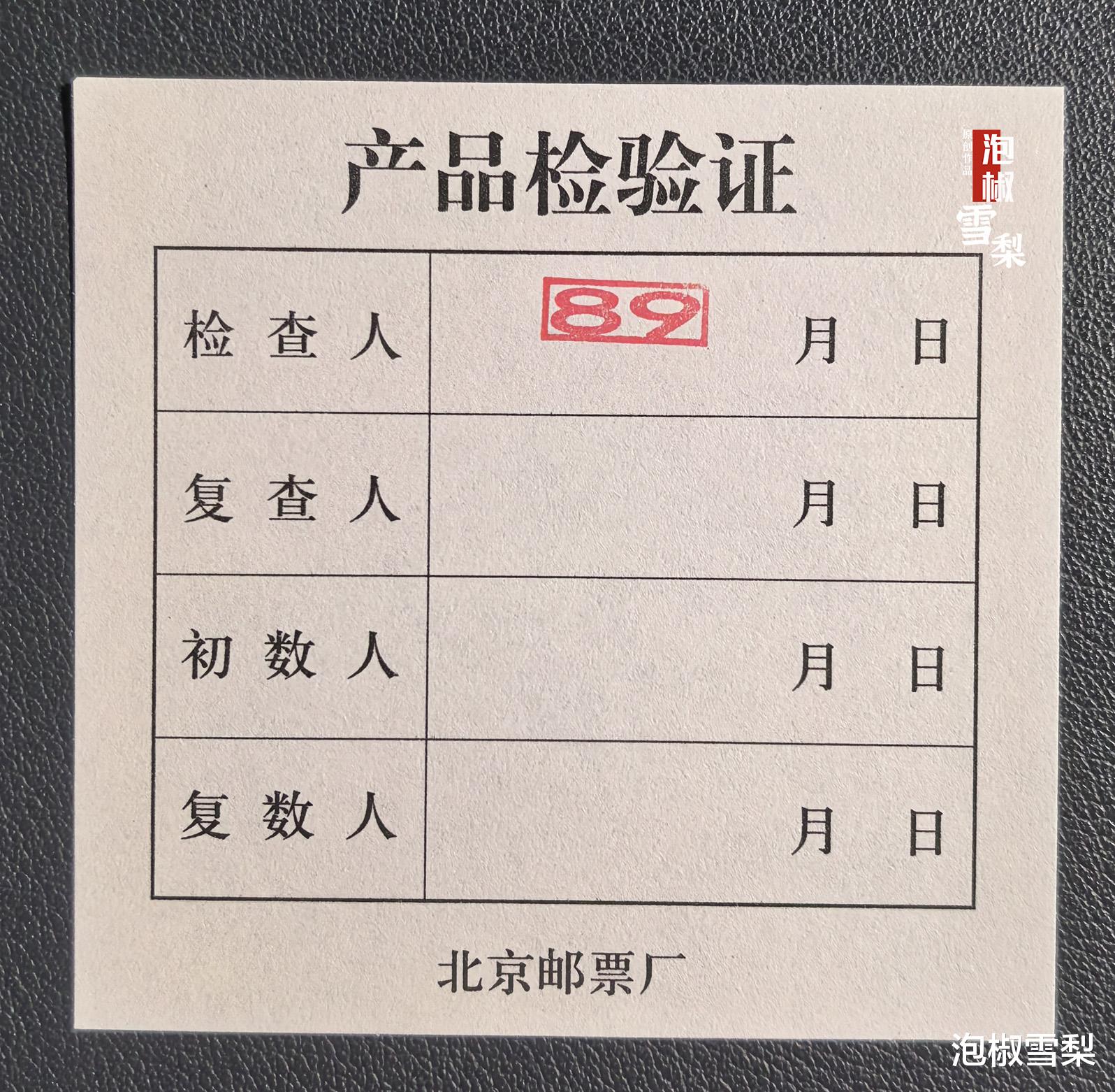 结语页之后还夹有一张“产品检验证”,检查人处盖有编号印章,复查人、初数人和复数人处则没有盖章,检验证下部有“北京邮票厂”字样。