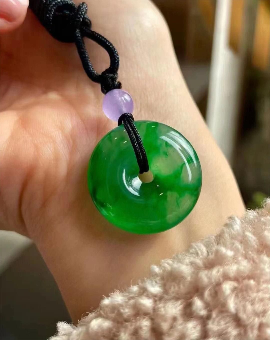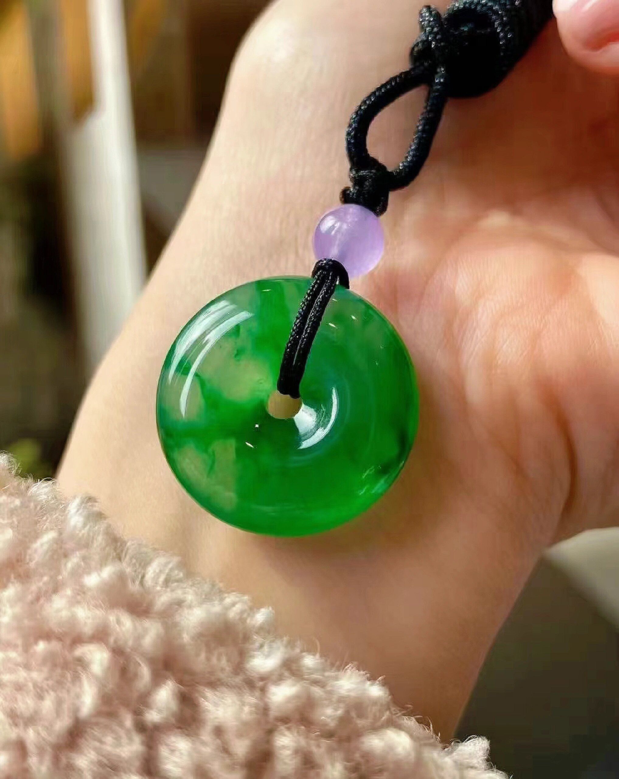 这款平安扣吊坠是设计师的精心之作,展现了翡翠的鲜灵生动之美。