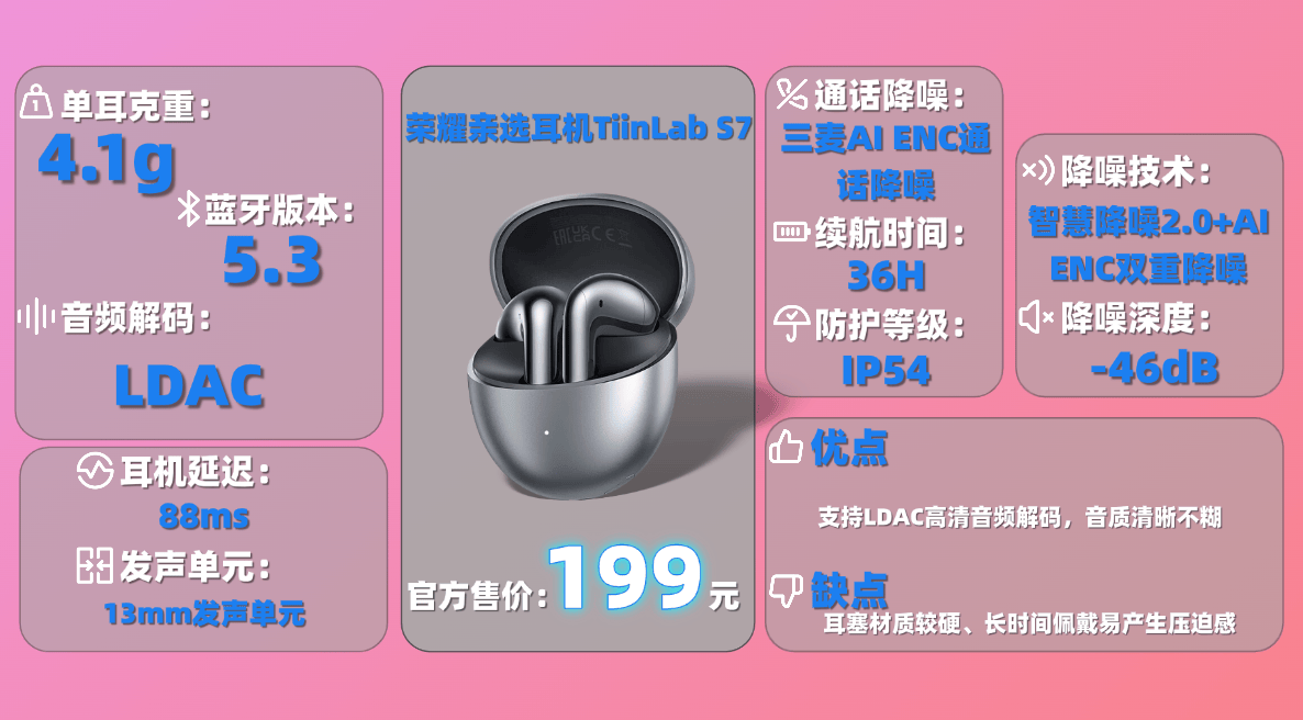 5、荣 耀亲 选耳机TiinLab S7蓝牙耳机
