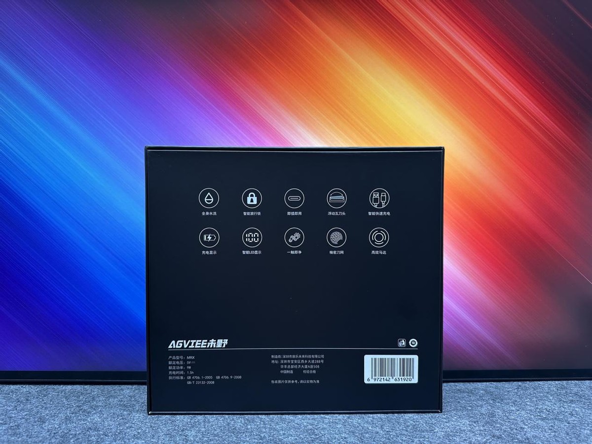 盒子底面是剃须刀的主要功能介绍。未野MRX五刀头往复式剃须刀采用高效马达,支持智能快速充电,可以全身水洗,还有智能LED智能显示等特色功能,让用户有更直观的了解。特别定制的绒面的固定卡盒,档次一下就上来了。