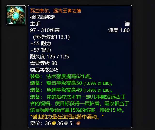 瓦兰奈尔·远古王者之锤是《魔兽世界》巫妖王之怒版本中由泰坦亲自铸造的传说级治疗武器,其背景与奥杜尔副本的泰坦科技及上古之神尤格-萨隆的剧情紧密相关。