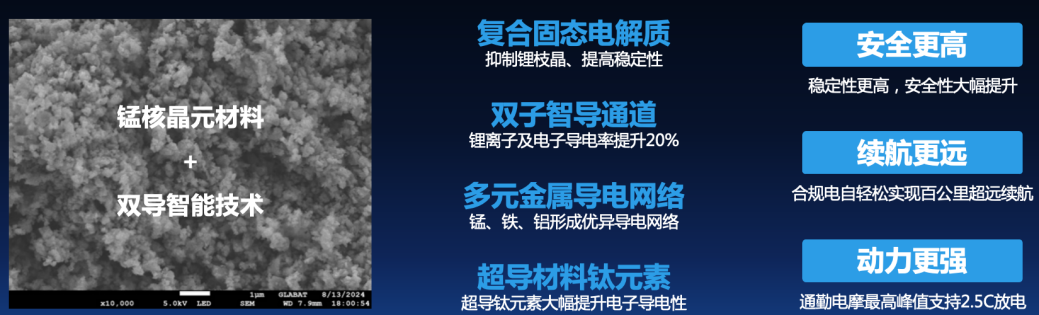 星恒超锂S30应用星恒自主研发的“锰核晶元材料+双导智能技术”,使用复合固态电解质、超导材料钛元素,形成了以锰、铁、铝、钛等元素为主的多元金属导电网络和双子智导通道,使锂离子及电子导电率大幅提升20%以上,实现更远续航和更高安全。