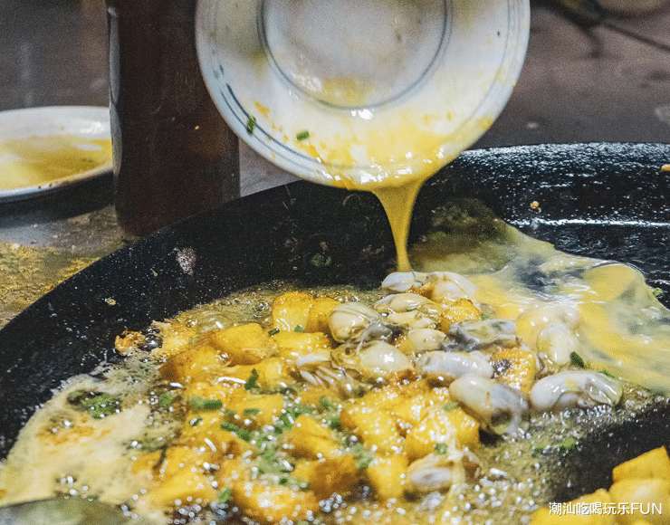小潮话音刚落,提前腌好的糕粿块 “溜” 进铁锅,“刺啦” 一声响,香气瞬间漫了满店。阿姨手腕一扬,打散的鸡蛋液均匀淋上去,金黄的蛋液裹着糕粿块,在锅里翻两圈就凝出薄脆的蛋衣。