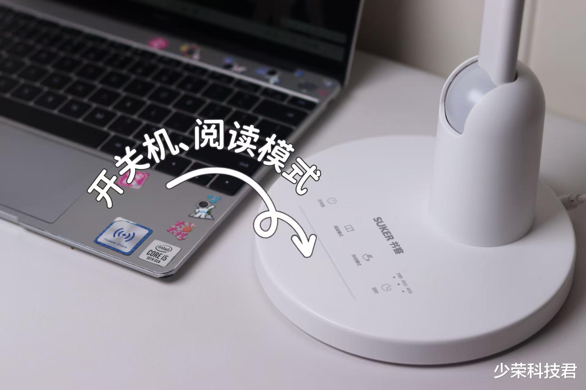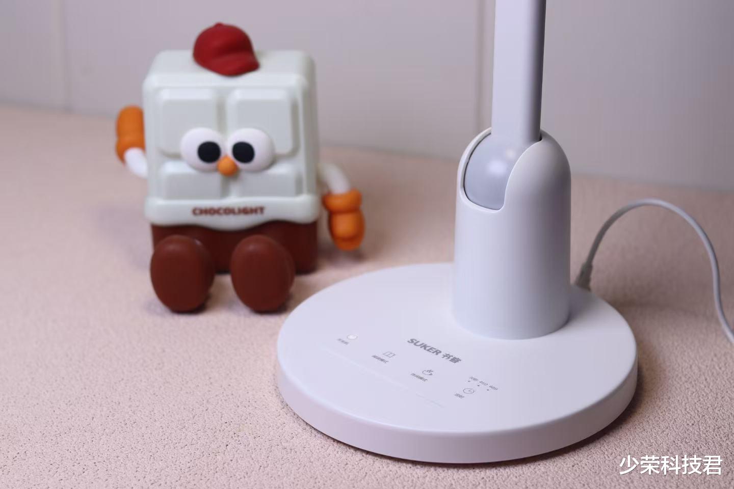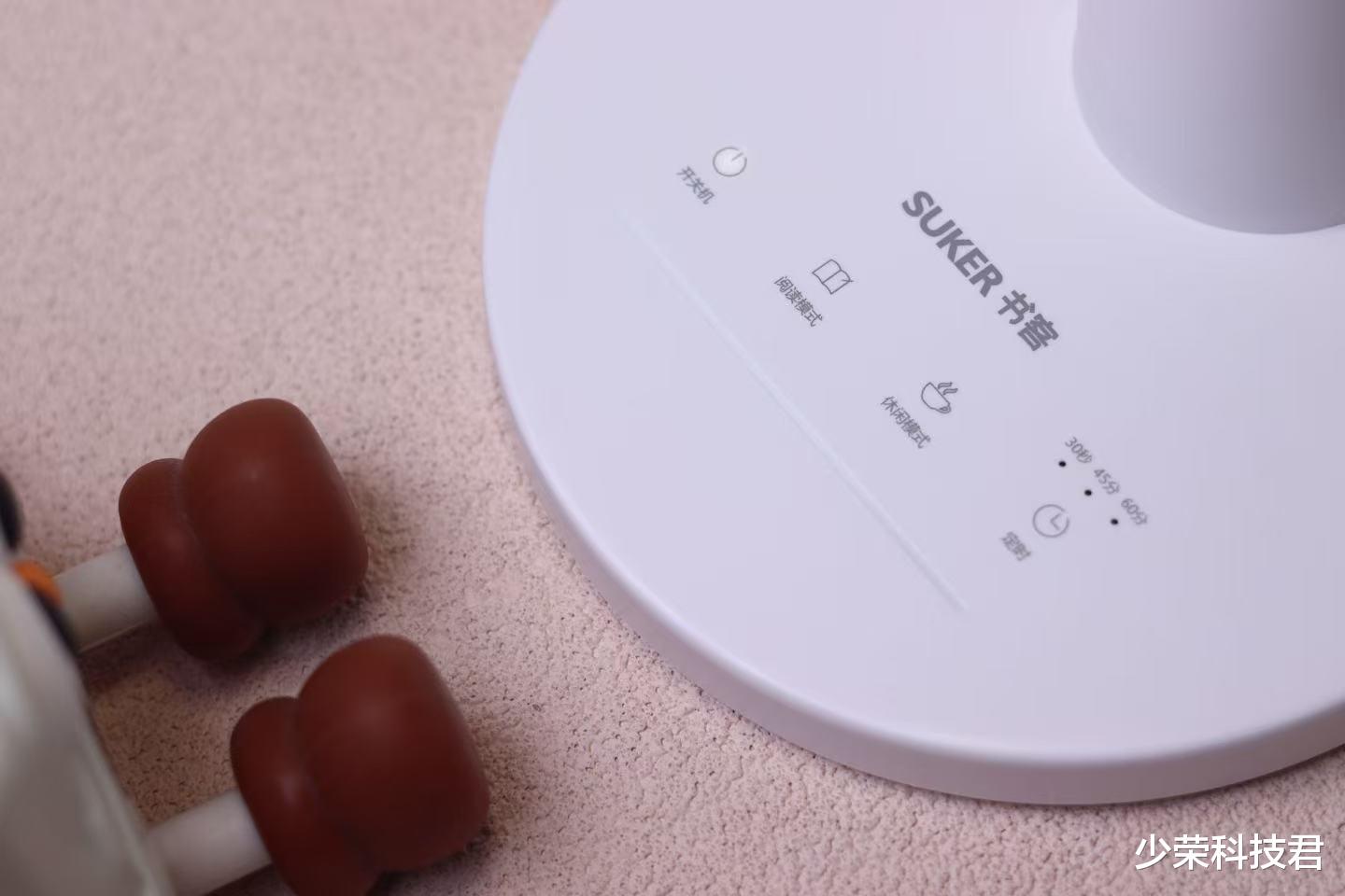 书客SKY护眼台灯通体白色,十分百搭;支撑杆和灯盘可以随意调节,适合各种角度照明;操作键均设置在底盘,从左到右分别是开关机、阅读模式、休息模式和定时(30s/45min/60min),并且可以触摸滑动调节亮度,操作简单。