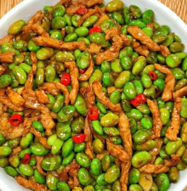 就着锅里的底油,放入姜末、蒜末和干辣椒段,小火煸炒,瞬间一股辛香便弥漫开来。接着将焯过水的毛豆倒入锅中,转大火快速翻炒,让每一颗毛豆都均匀地裹上热油和香料的滋味。翻炒约一两分钟后,将之前炒好的肉丝重新倒回锅里,与毛豆汇合。