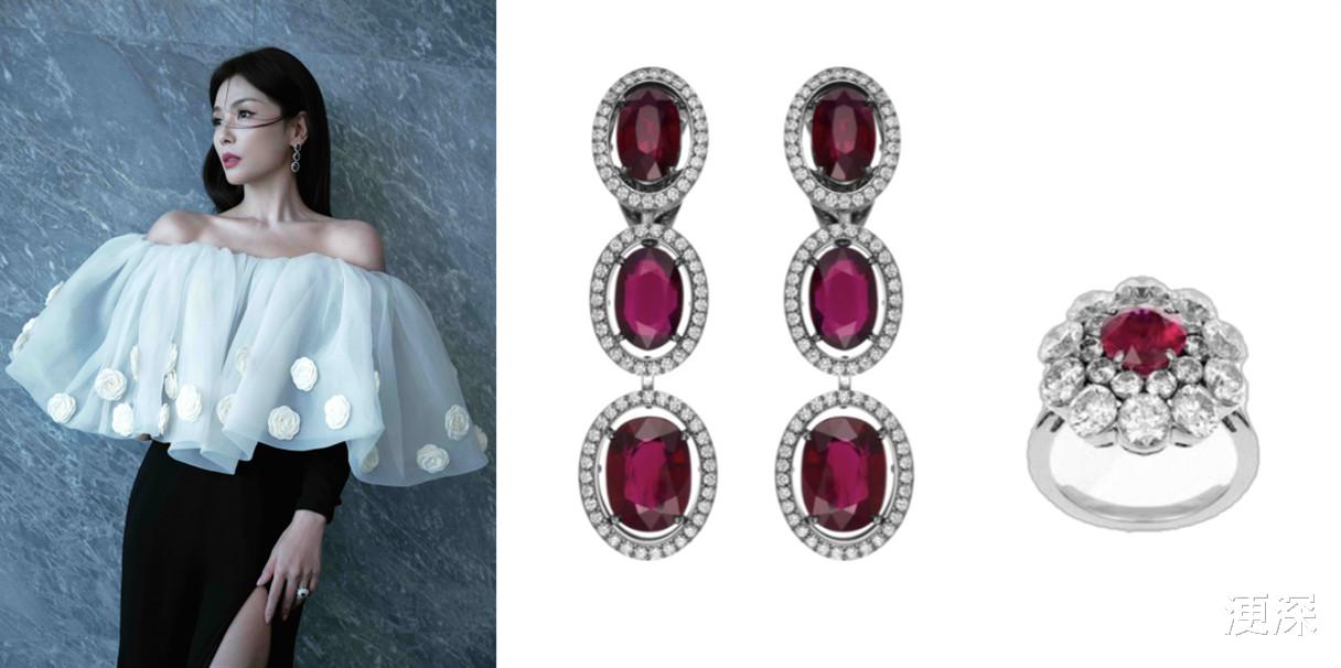 演员刘涛耳际佩戴Chopard萧邦高级珠宝系列耳环,镶嵌6颗总重22.41克拉椭圆形切割红宝石,与澄澈美钻交织斐然光泽,辉映绰约之姿。同系列戒指于指尖闪耀焕放盈盈钻辉,馥郁红韵耀衬动人韵致。