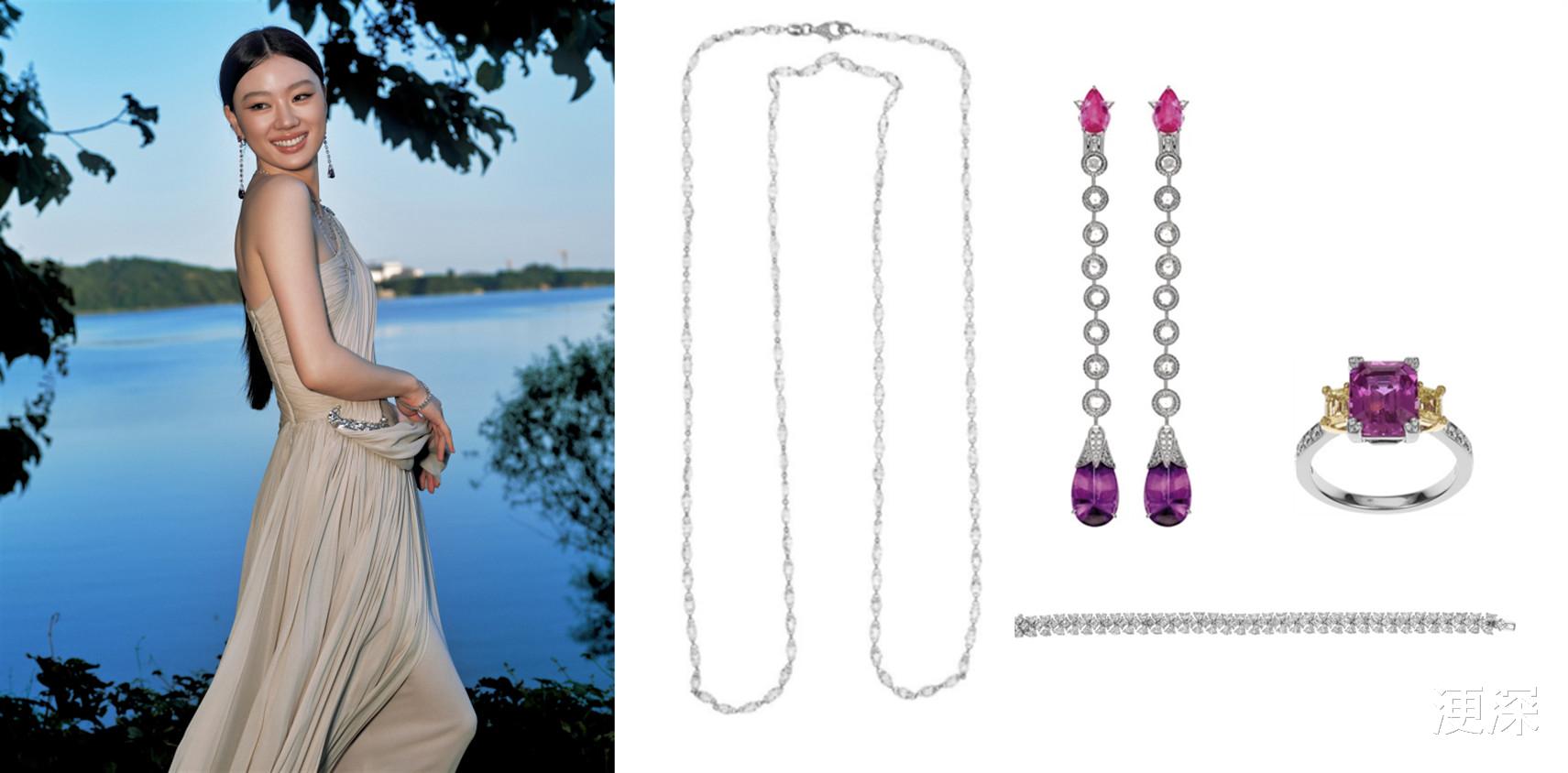 歌手单依纯颈间佩戴Chopard萧邦高级珠宝系列项链,层叠臻钻织就璀璨光影。同系列耳环镶嵌两颗总重14.24克拉的梨形切割紫水晶,于耳畔摇曳生辉,萦绕身畔曼妙闪耀。指尖戒指点缀一颗粉色蓝宝石,耀目黄钻于两侧凝聚瑰美华泽,与腕间手链熠然辉映,定格优雅之姿。