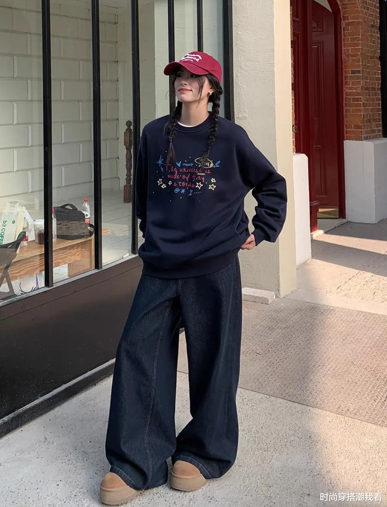 想避免这种单调感,可以试试“上宽下紧”的穿法。选一件oversize卫衣,长度盖过臀部,下装搭一条紧身或微喇牛仔裤,形成“上松下紧”的对比,既显瘦又有层次感。