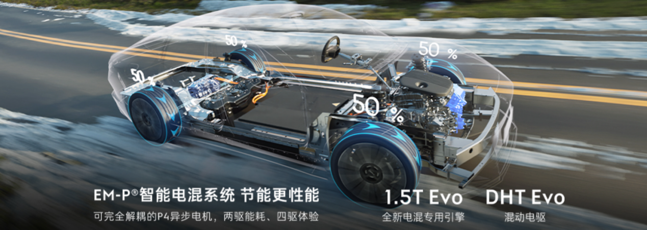 实现这一理念的基础是可靠的技术支撑。EM-P智能电混系统融合了多项先进技术,1.5TEvo电混专用引擎与DHT Evo混动电驱协同后桥P4电机工作,输出390kW系统综合最大功率和755N·m系统综合最大扭矩,0-100km/h加速时间5.1秒。系统能效出色,CLTC工况亏电油耗4.2L/100km。后桥P4电机的快速响应能力达到10毫秒级别,确保了四驱模式的瞬间切换,这不仅提升了操控体验,也增强了行车安全性。