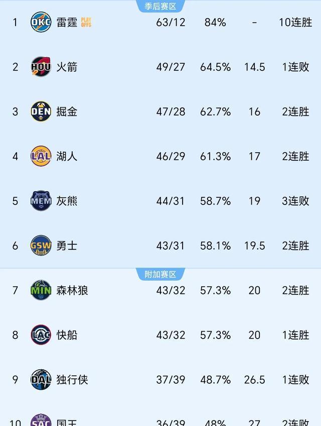 咱们再看看西部排名这盘大棋。当时湖人、掘金和火箭三队咬得那叫一个紧啊,就像包饺子的馅,你看我我看你的。勇士和快船他们几个队在后面争第五名也忙得不可开交。随着赛季一天天过去,这排名就跟天气预报似的,说变就变。这西部的格局啊,真就像那孙猴子的金箍棒——说大就大,说小就小,充满了不确定性。