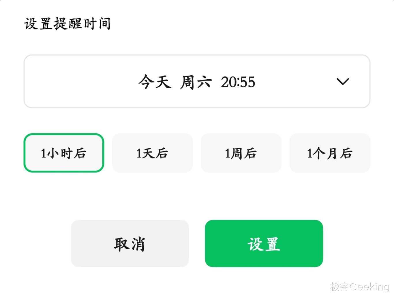 微信的提醒功能有了新变化,新增了一些备选时间的快捷选项,包括「1小时后」「1天后」「1周后」和「1个月后」的选择,给出了用户可能最常用的提醒时间,无需手动拨动选择,只需要点击这些快捷选项就能快速完成提醒设置。