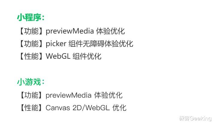 除了上述的功能变化之外,此次微信还带来了小程序和小游戏的性能和体验优化,具体如下: