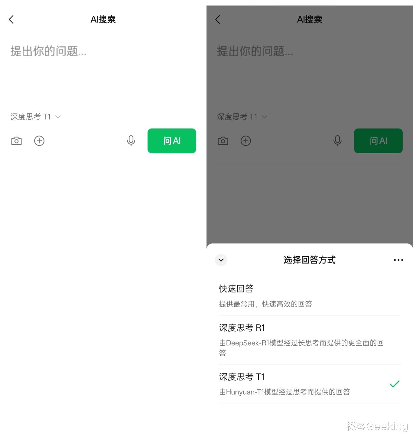而「AI搜索」已大范围覆盖,其支持三种回答方式,分别是快速回答、深度思考 R1 和深度思考 T1,在搜索特点上有所不同。