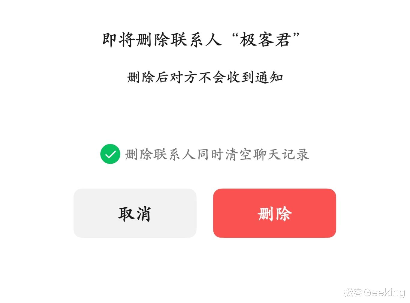 当删除好友时,在删除页面会显示「删除联系人同时清空聊天记录」的选项,默认是勾选状态,如果不勾选则会保留聊天记录。