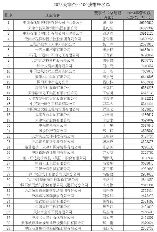9月11日,天津市企业联合会、天津市企业家协会联合发布了“2025天津企业100强”榜单。其中,多家市属、区属国有企业榜上有名。
