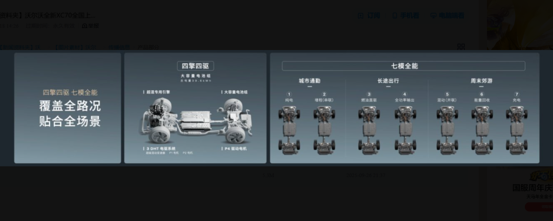作为“豪华超混第一车”,全新XC70有着全能产品力。其采用“四擎四驱”动力系统,实现了“一车当四车”用。在动力系统上,该车采用1.5T混动专用发动机,热效率超过了44%。再配合P1+P2+P4三电机组合,综合功率340kW,零百加速5.28秒。在该组合下,亏电后发动机可直驱,动力依旧充沛,可以做到低速有、高速稳,也就是“性能长续航”,性能与效率兼备。而沃尔沃独创3DHT变速箱可实现七种工作模式无感切换,最大纯电续航超200公里,综合续航超1200公里,长途出行告别焦虑。