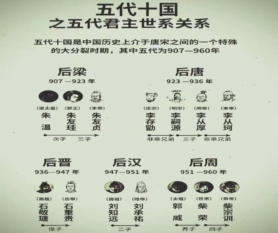 先看北方的五代:后梁、后唐、后晋、后汉、后周,五个王朝没一个活过 30 年,皇帝换得比 “翻书” 还快。后梁朱温靠背叛唐朝上位,最后被自己儿子杀了;后唐李存勖打天下时挺厉害,当了皇帝就跟戏子混在一起,最后被叛军杀了;最荒唐的是后晋石敬瑭,为了借契丹的兵夺权,竟然把 “燕云十六州” 割给了契丹,还认契丹皇帝做 “爸爸”!