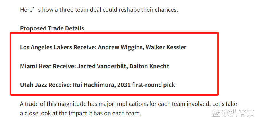 潜在3方交易的详情如下洛杉矶湖人队得到:维金斯、沃克・凯斯勒