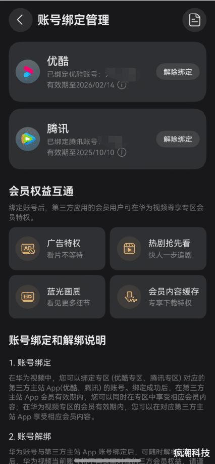 当我追完更新,意犹未尽想去考古一下娜扎以前的作品时,突然发现华为视频整合了芒果TV、优酷、腾讯等多家视频平台的影剧综内容。以前我想重温娜扎,那叫一个折腾:想看《择天记》得打开腾讯,想看《风起西州》又得切到优酷……手机桌面排排坐,占内存不说,来回切换简直逼死强迫症。而现在,我只需要在华为视频里绑定已有的腾讯、优酷账号,就能直接在一个应用里观看这些平台的会员内容,不用反复跳转。