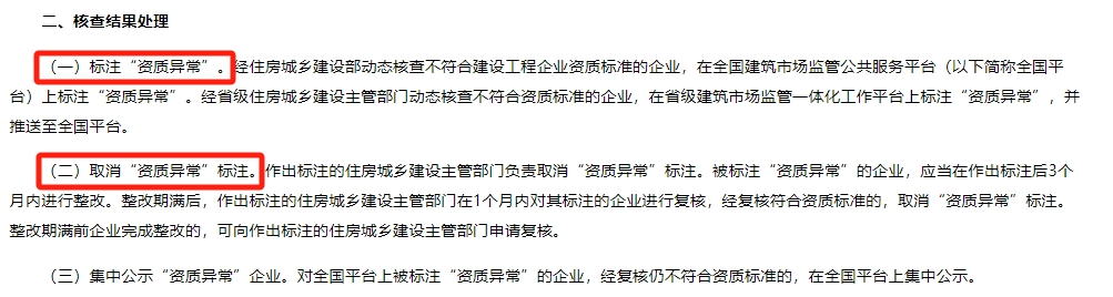 如果想要取消”资质异常“标注,需要在3个月内进行整改,而且住建部也会在1个月内对其标注的企业进行复核,复核符合资质标准的,才会取消”资质异常“标注,但如果复核仍然不符合资质标准,依旧会在全国平台上集中公示。