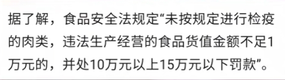 根据《食品安全法》规定,未按规定进行检疫的肉类,违法经营获利的金额不足1万元的, 罚款10万元起步,最高不超过15万元。