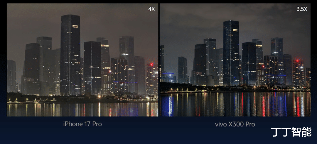 官方直接放了和 iPhone 17 Pro 的夜景对比图,X300 Pro 拍出来的夜景,暗部细节清清楚楚,灯光不糊不溢,iPhone 17 Pro 直接被比下去,说是吊打一点不夸张。