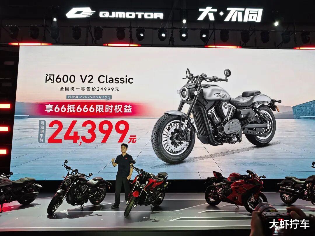 闪600V2 Classic其实已经在8月底通过网络平台正式发布,它是一台带有550ccV2发动机的传统巡航车,比闪系列的小排量车型体量更大,QJMOTOR官方称之为“Cyber Flash”设计风格,小编却觉得更偏向传统和经典。这款车搭载的是一台实际排量550cc的V型双缸水冷发动机,最大功率38.5kW/峰值扭矩53N.m,采用缸径行程为1:1的长行程设计并配备平衡轴,在低转速域即可释放更多扭矩。