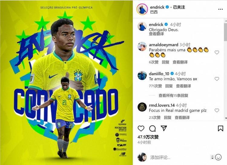 在社交媒体上,恩德里克晒出了一张海报,上面印有他身穿巴西国奥队球衣的照片。他在照片下方写道:“感谢上帝,我已经入选了巴西国奥队!”这句话表达了他内心的喜悦和感激之情。