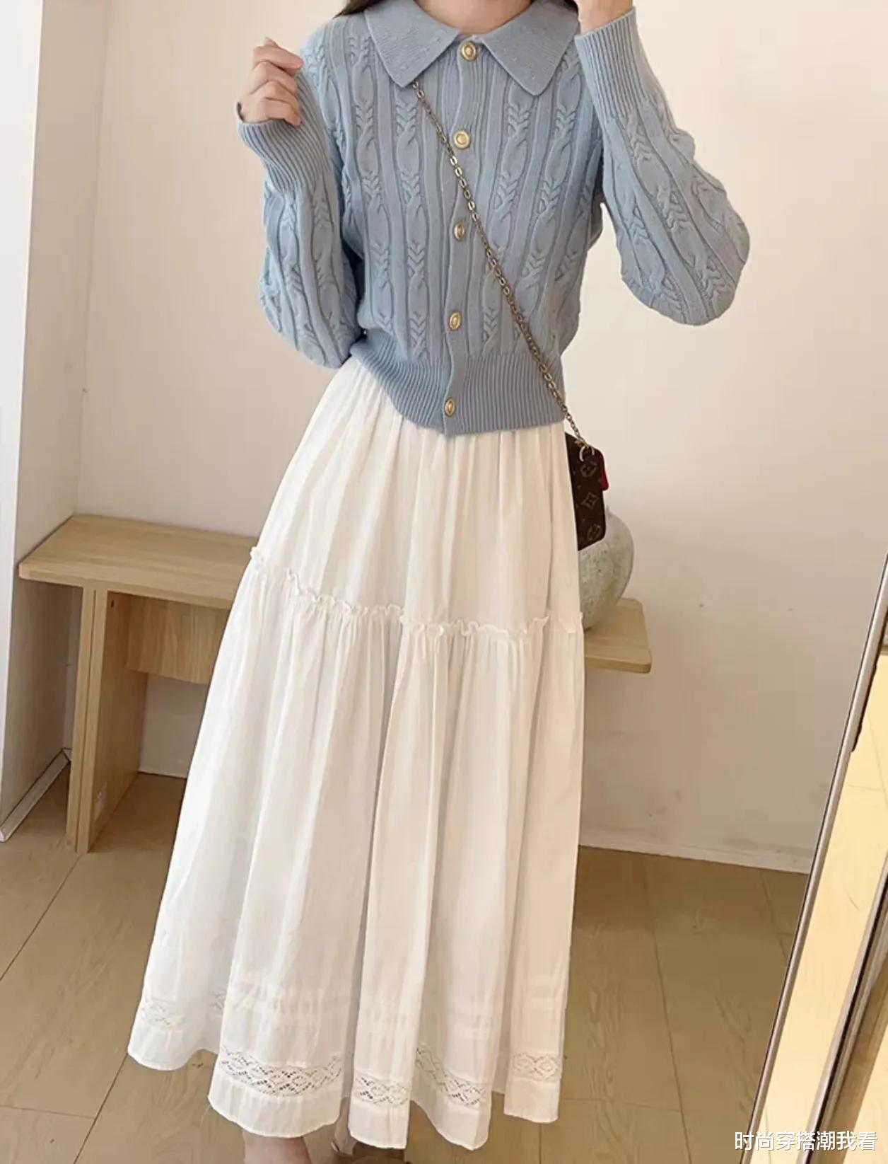 一件基础款的纯色针织衫,搭配一条A字版型的半身裙,长度到小腿肚附近,既不会过于暴露,又能展现出纤细的脚踝。