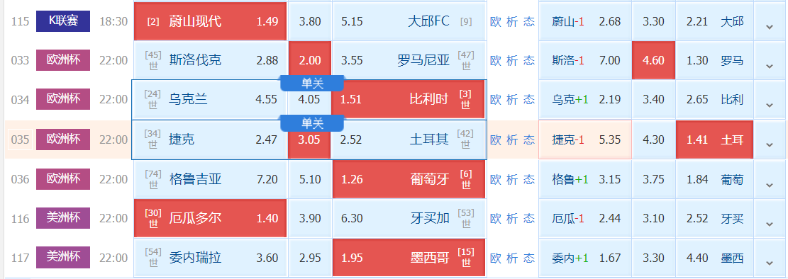 【不利】1、防守:捷克在最近6场的比赛中均被对手进球,球队近期后防线发挥不稳定;2、交锋:捷克以往8场对上土耳其的交锋中取得2胜5负1平,球队历史交锋不占优;3、数据:捷克在过去5场比赛中只赢下一场数据,球队近期数据能力不理想;4、伤病:捷克头号进攻火力点希克上轮对格鲁吉亚时因伤离场,存在伤病隐患。