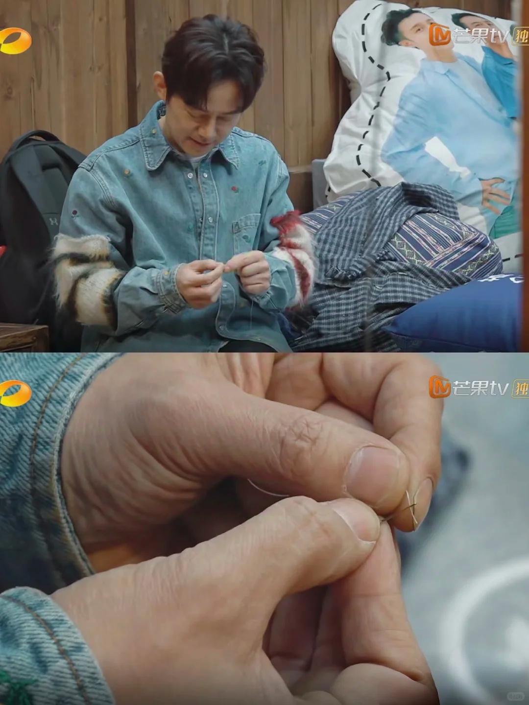 有一次节目组安排做针线活,他拿着针和线,眼睛瞪得溜圆,手却控制不住地抖。