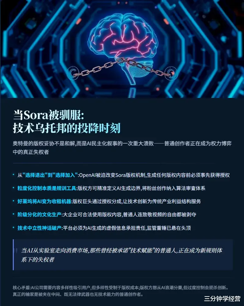 当萨姆·奥特曼宣布Sora将"尊重版权"时,他或许真的相信这是技术与法律和解的必要代价。但历史一次次证明,当技术向既有秩序妥协,失去的往往不仅是创新的空间,更是那些最初被承诺赋能的人们的希望。