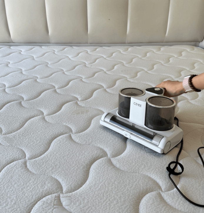 此外,希亦RM1除螨仪还支持65°C恒温热风功能,这不仅是烘干,更能驱除纤维深层湿气,抑制螨虫滋生,特别适合南方潮湿环境或者家里有孩子、宠物的家庭使用。加上AI尘螨感应系统,可根据床品脏污情况动态调节功率,绿光显尘灯让清洁过程直观可视,22cm宽吸口让大床几分钟就能搞定,省力又高效。可视双杯设计和七重HEPA强效过滤系统确保吸入污染物完全捕捉,杜绝二次污染。